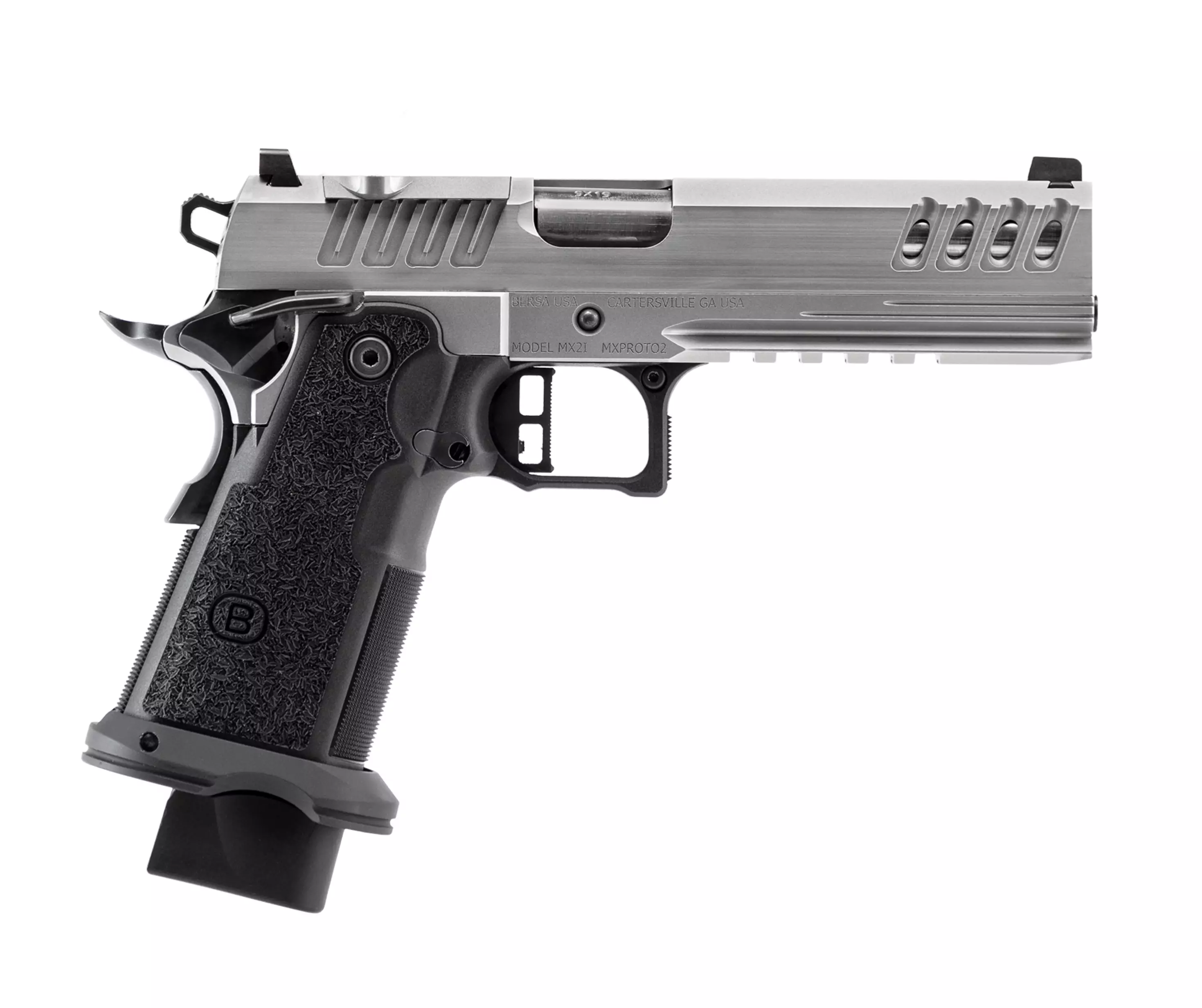 Bersa M2XI 9mm 18rd/22rd SS OR 2011 Pistooli on täysikokoinen 2011-tyylinen, tuplarivinen 1911-alustainen pistooli, joka on suunniteltu suorituskykyyn. Ruostumattomasta teräksestä valmistettu luisti ja runko sekä 5 tuuman ultra-match bull-piippu tekevät kokonaisuudesta jämäkän ja tarkkuutta tukevan, kun tavoitteena on hallittu laukaisu ja varma toiminta.