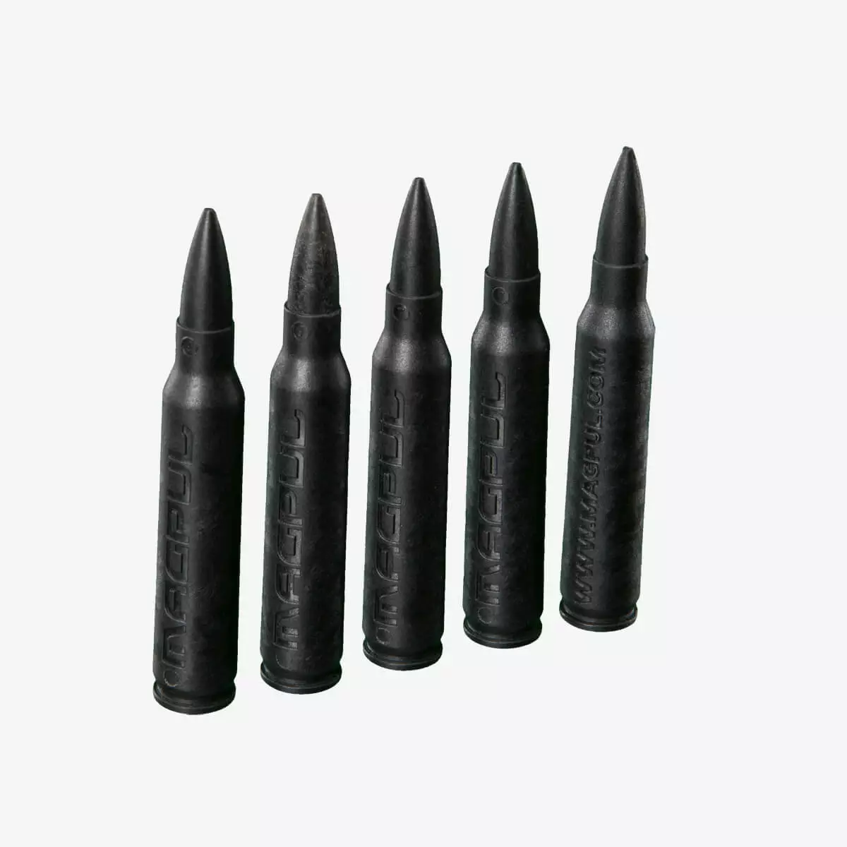 Magpul Dummy Rounds - 5.56x45, 5 Pack latausharjoituspatruunat on inertti viiden kappaleen pakkaus 5.56x45 mm (.223 Remington) -kaliiperin patruunan muotoisia polymeeripatruunoita, jotka on suunniteltu turvalliseen aseenkäsittelyyn, latausharjoitteluun, häiriötoimintaharjoituksiin ja ampumasuoritusten analysointiin; kova, Magpulin oma polymeerirakenne kestää toistuvaa syöttöä ja ulosvetoa, ja tuote on valmistettu USA:ssa (NSN: MAG215-BLK 1005-01-591-5927).