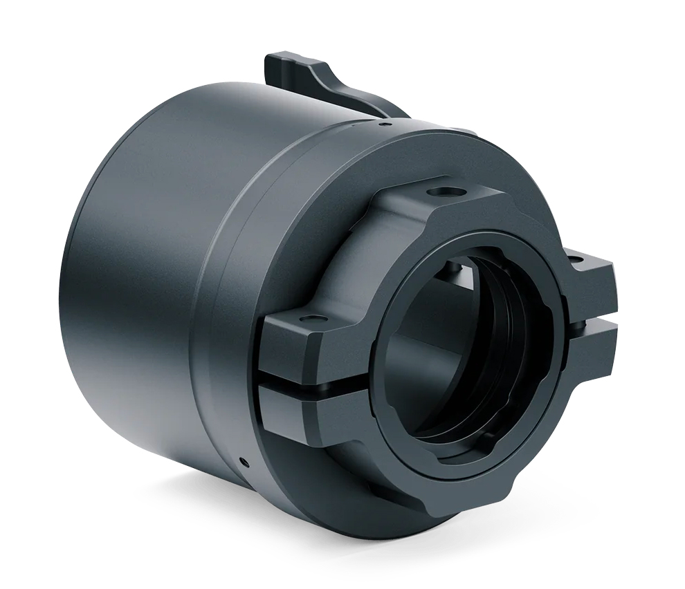 Lämpökuvausliitin kiinnitetään sovittimeen nelipiste-bajonetin avulla. Bajonettiliitin on erittäin luotettava ja nopea ja helppo kiinnittää. Kiinnitys irrotetaan sovittimesta ja asennetaan toiseen ilman erikoistyökaluja, joten voit nopeasti ja helposti muuttaa metsästäjän arsenaalissa olevat päiväoptiikat lämpökuvausoptiikaksi.
