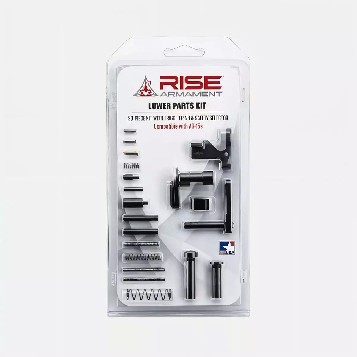 Rise Armament Lower Parts Kit varaosasetti on AR-15 Lower Parts Kit ilman triggeria, eli se sisaltaa lower receiverin kaikki toimivat komponentit liipaisinta lukuun ottamatta ja on yhteensopiva mil-spec AR-15 -alustoihin. Mil-spec -yhteensopivuus varmistaa sopivuuden standardin mukaisiin lower runkoihin, ja setti sopii niin uuden rungon kokoamiseen kuin kuluneiden osien vaihtoon.