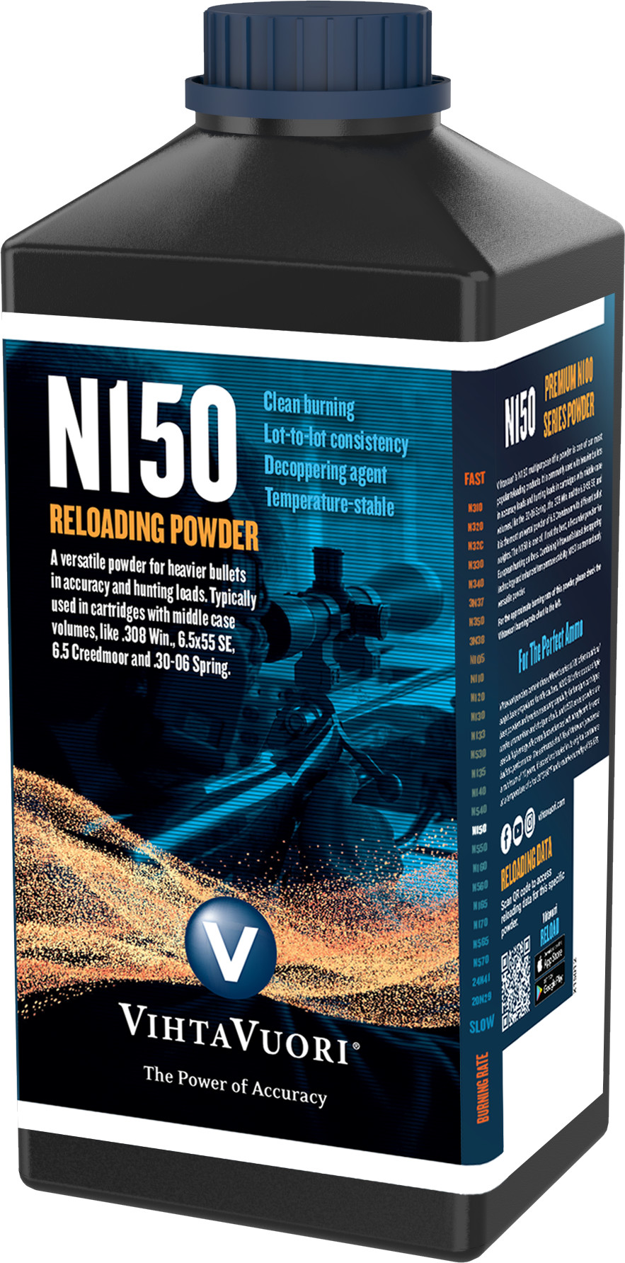 Ladataan tiedostolistaa...Vihtavuori N150 savuton ruuti 1 kg pakkauksessa. Suomalaiset Vihtavuori-ruudit ovat puhtaasti palavia, lämpötilastabiileja ja tasalaatuisia. Vihtavuoren ruudeilla suomalaiset metsästäjät ovat ladanneet tarkkoja patruunoita jo vuosikymmenten ajan! Nämä N100-sarjan ruudit ovat tarkoitettu lähinnä kiväärikaliipereihin. Vihtavuoren latausoppaasta löydät kaiken tarvittavat tiedon oikean ruudin valitsemiseen (katso alla oleva video).